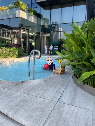 특히 아침부터 이용자들이 바른 선크림 종류 때문에 수영장에 들어가서 첫눈에 들어온 게 물 위에 덮인 선크림 기름때였습니다. 그걸 딱 보는 순간 들어가기 싫어졌습니다. 그런데 아이랑 같이 가서 안 들어갈 수는 없고 최대한 깨끗해 보이는 안쪽으로 들어가서 이용을 했습니다. 같은 시간대에 수영장에 간 다른 한국인 분들도 계셨는데 똑같은 말씀을 하시는 걸 들었습니다. 수영 오래는 못하겠다며 사진만 찍고 내일 아침에 다시 오자고 하셨어요.